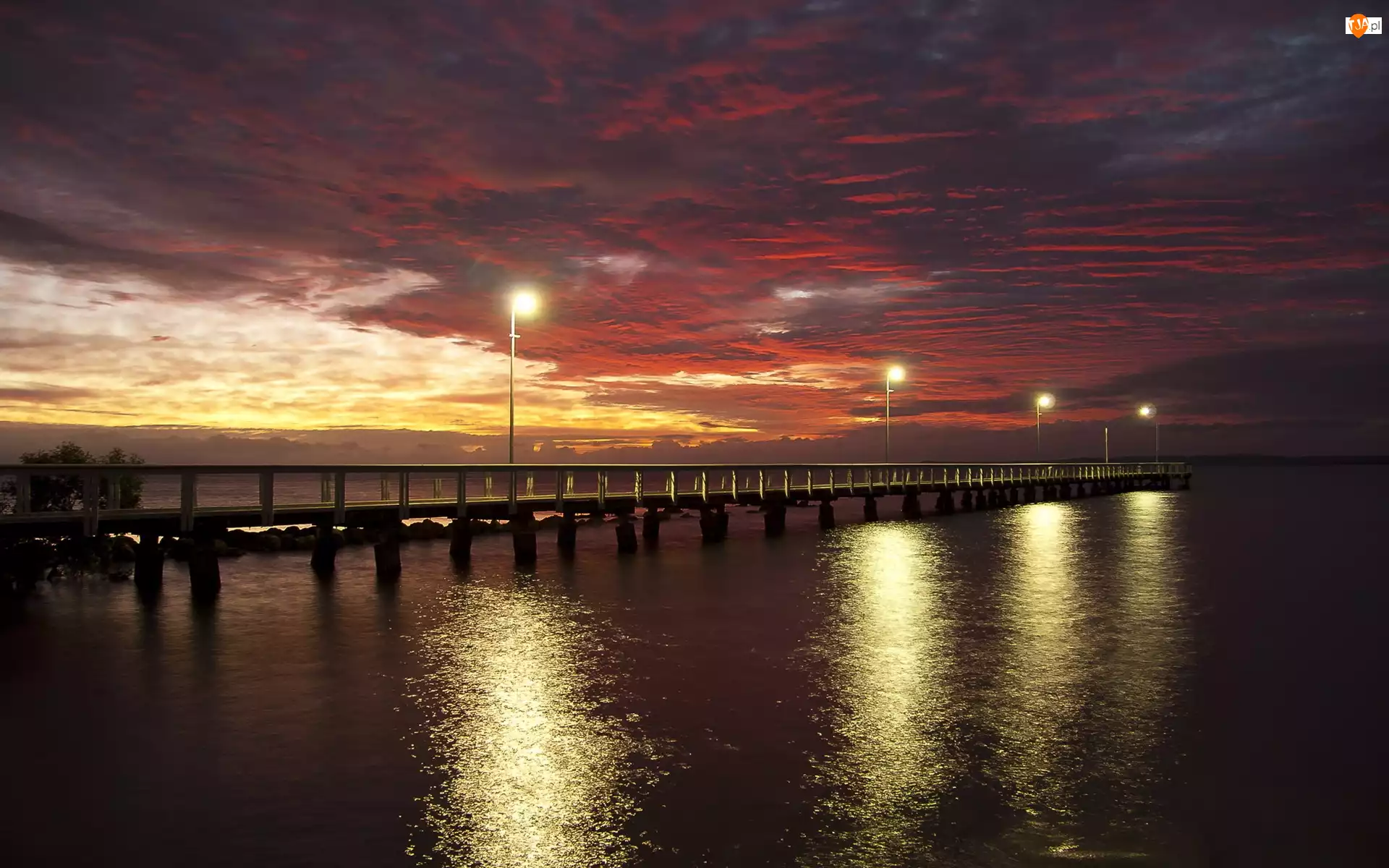 Latarnie, Zachód, Jezioro, Słońca, Pomost, Chmu