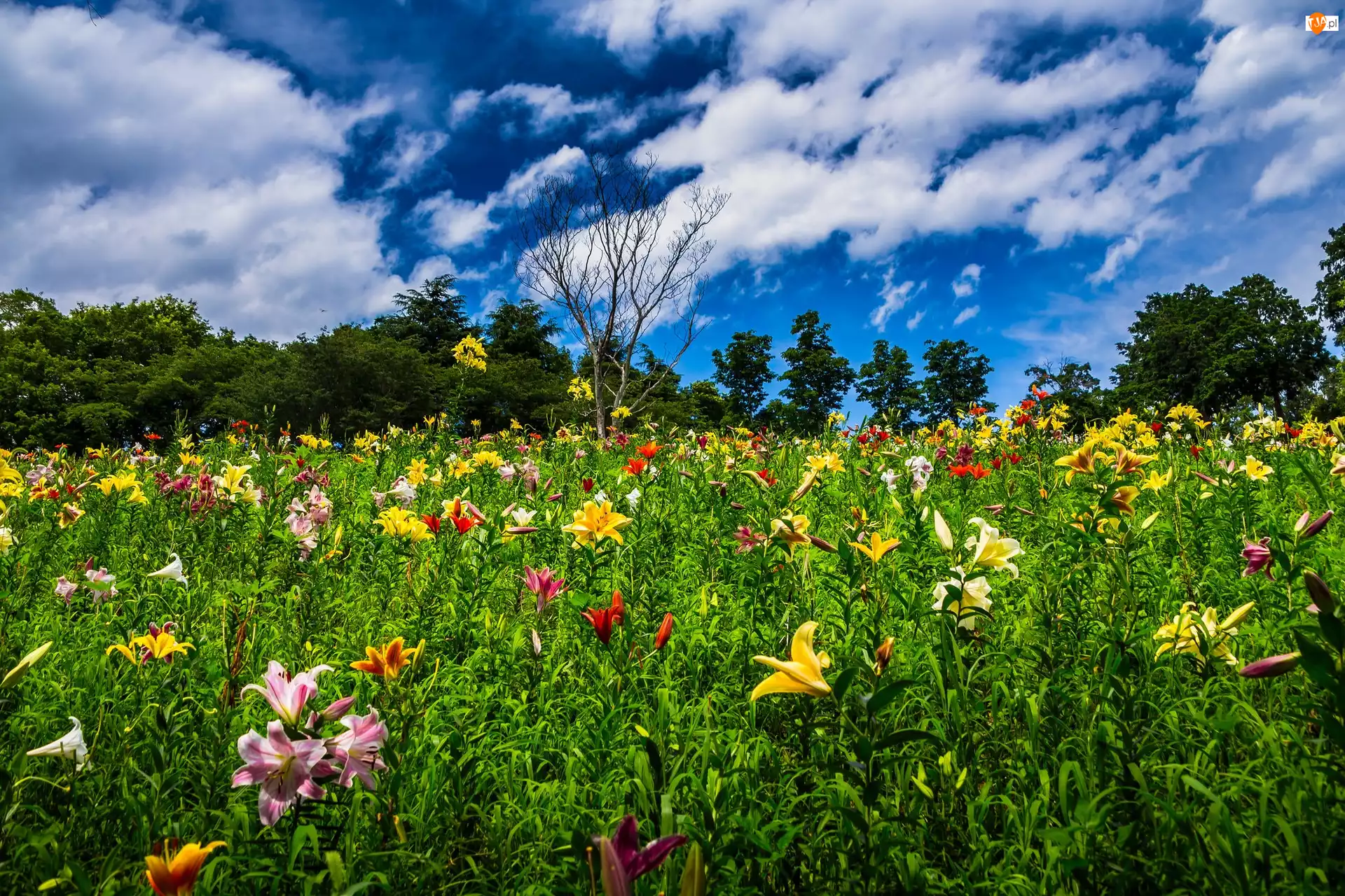 Drzewa, Lato, Lilie, Łąka, Niebo