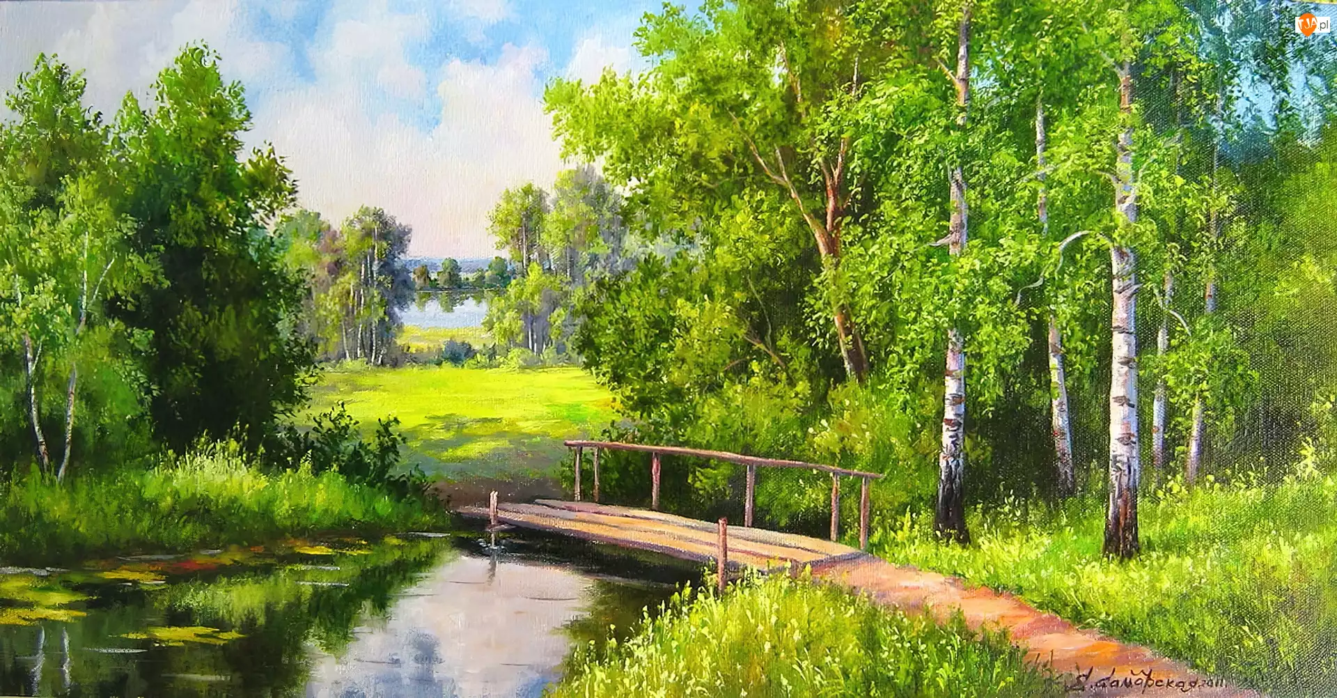Lato, Zagajnik, Rzeka, Brzozy, Kładka