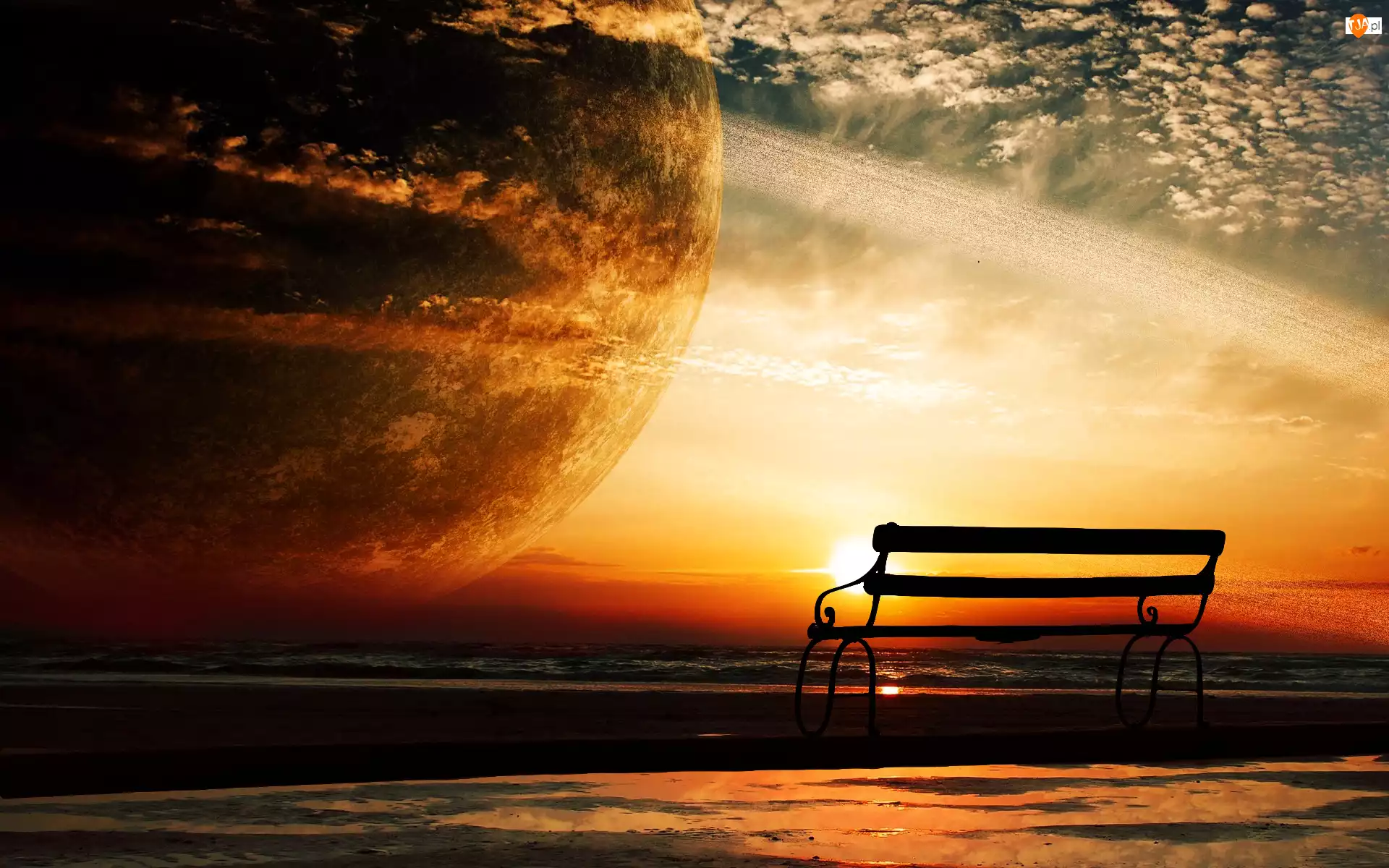 Morze, Planeta, Zachód słońca, Ławka, Fantasy