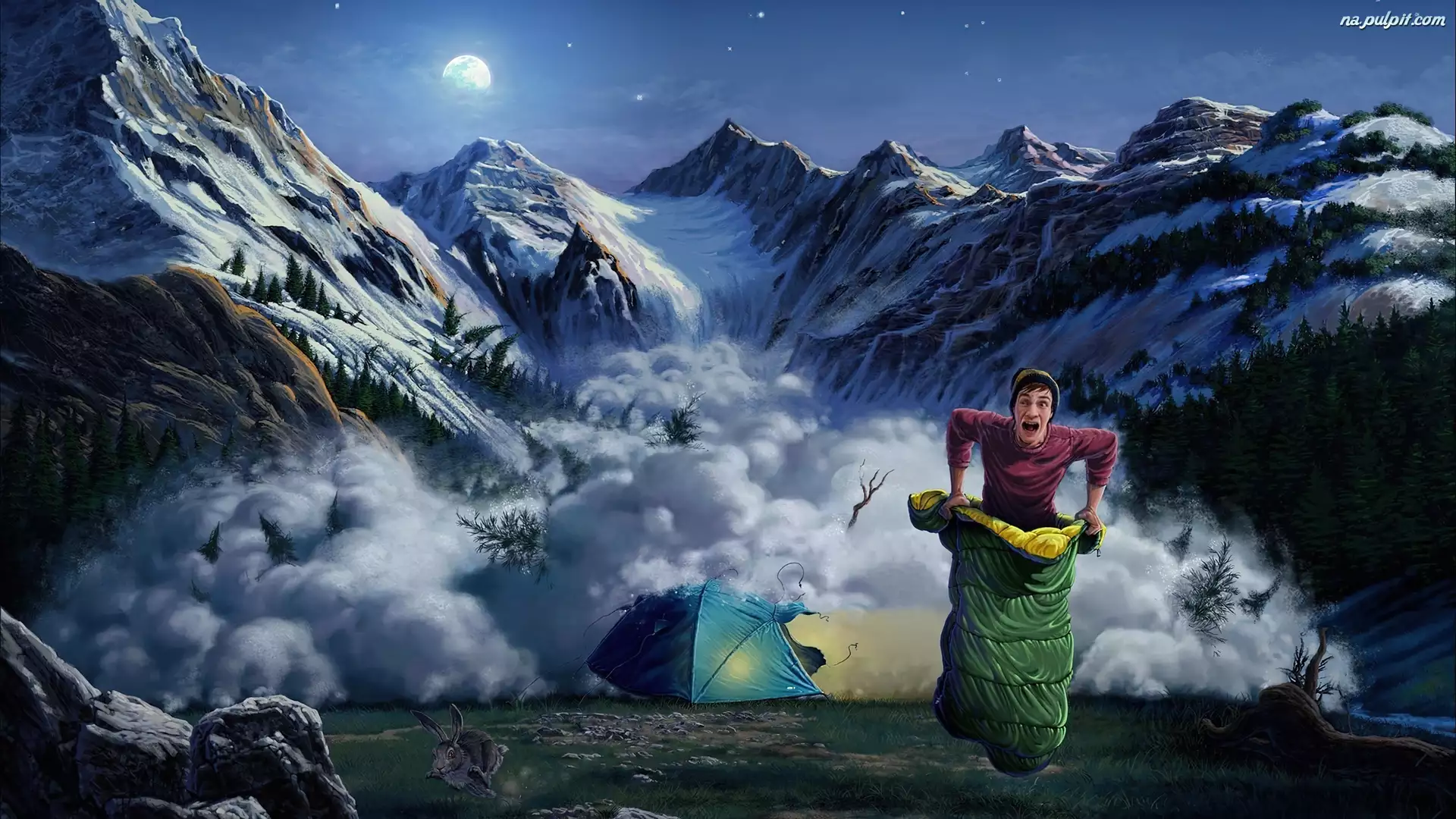 Lawina, Śpiwór, Noc, Namiot, Góry, Człowiek