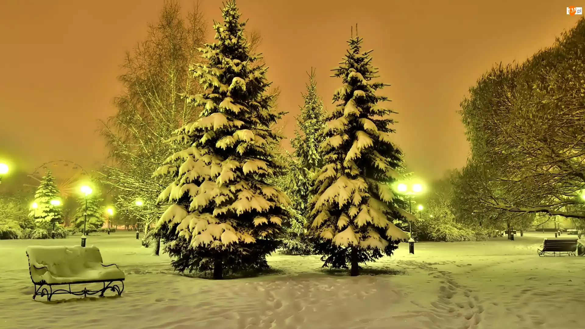Ławka, Drzewa, Zima, Latarnie, Park, Ośnieżone