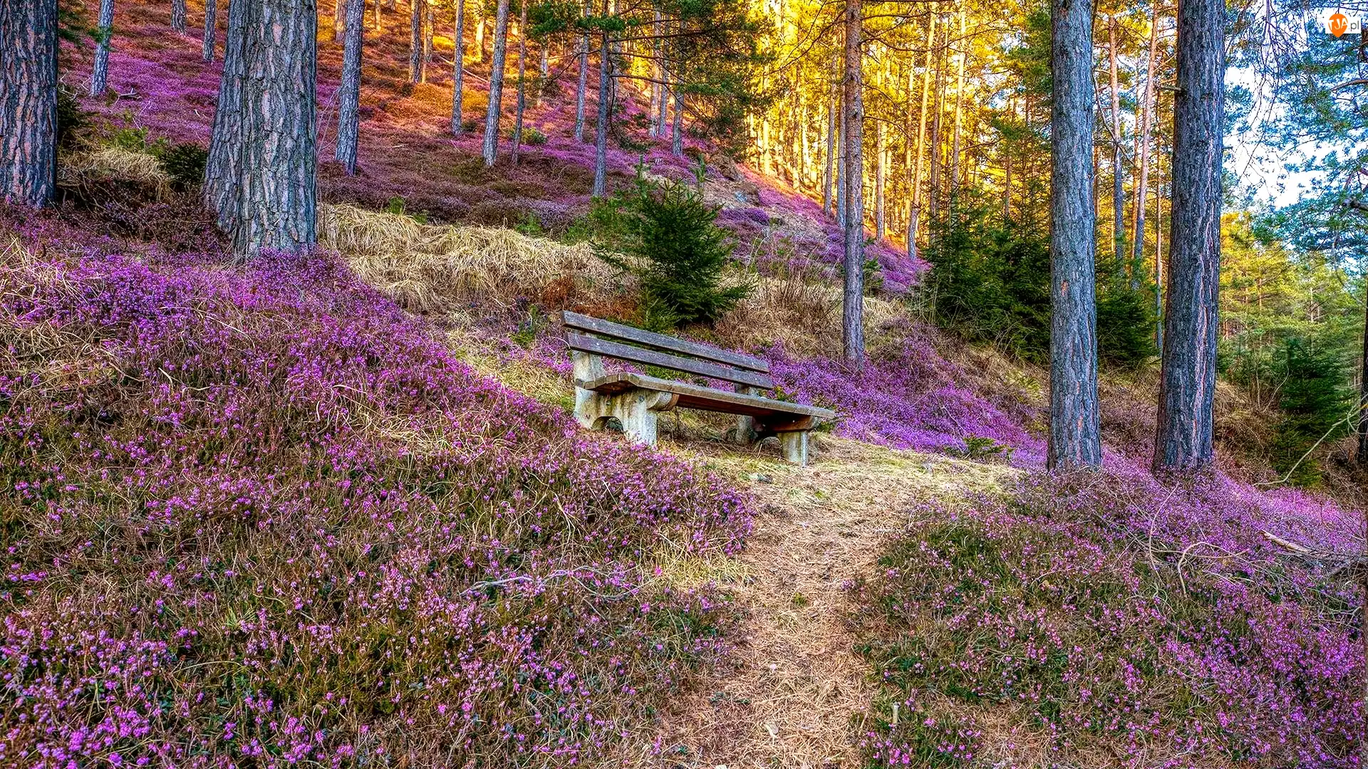 Las, Wzgórze, Drzewa, Wrzosy, Wrzosowisko, Ławka
