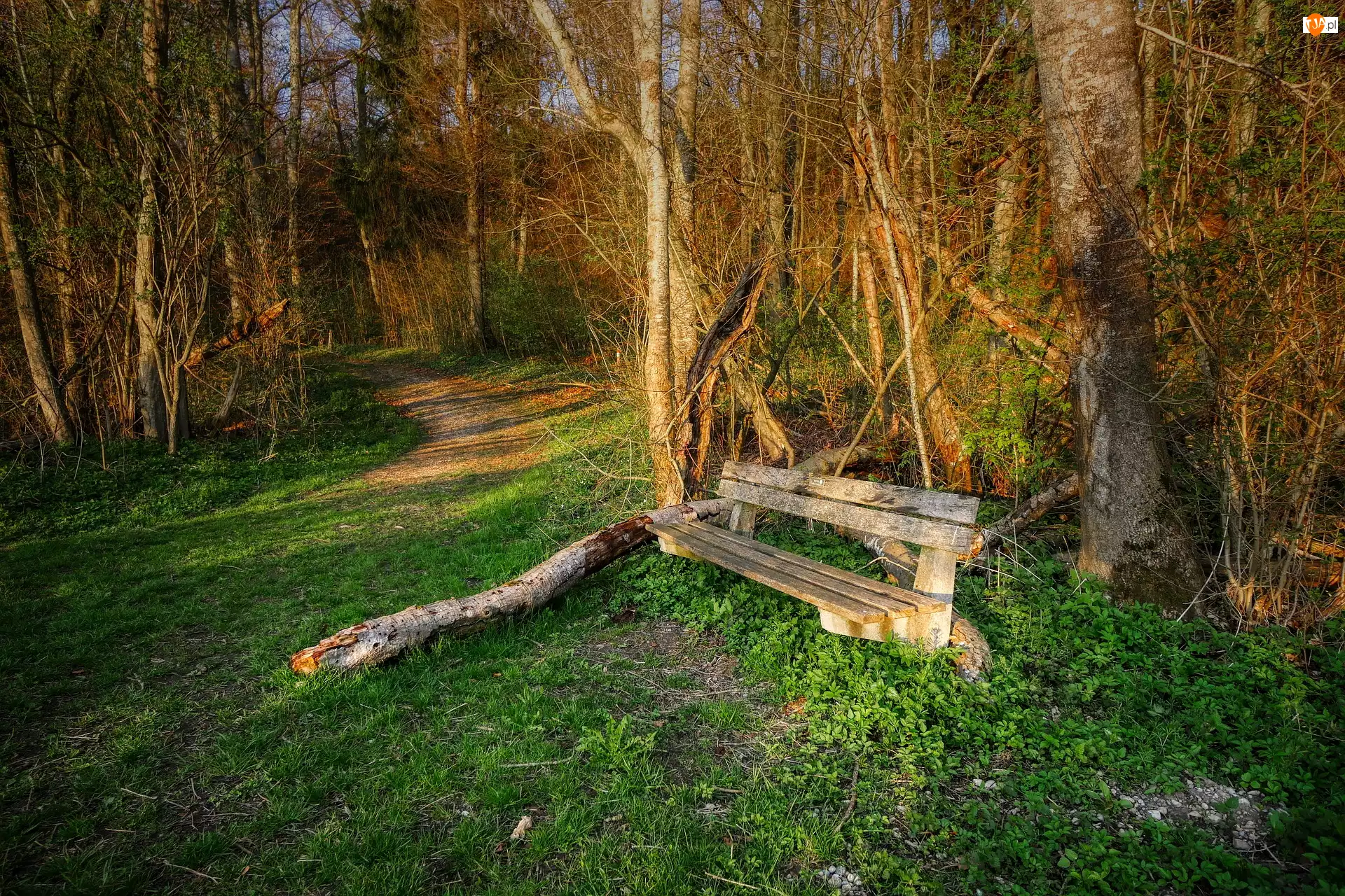 Ścieżka, Ławka, Las, Wiosna, Drzewa