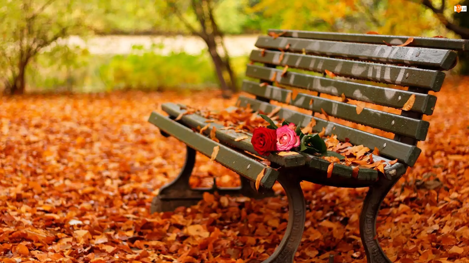 Ławka, Róże, Jesień, Staw, Park, Liście