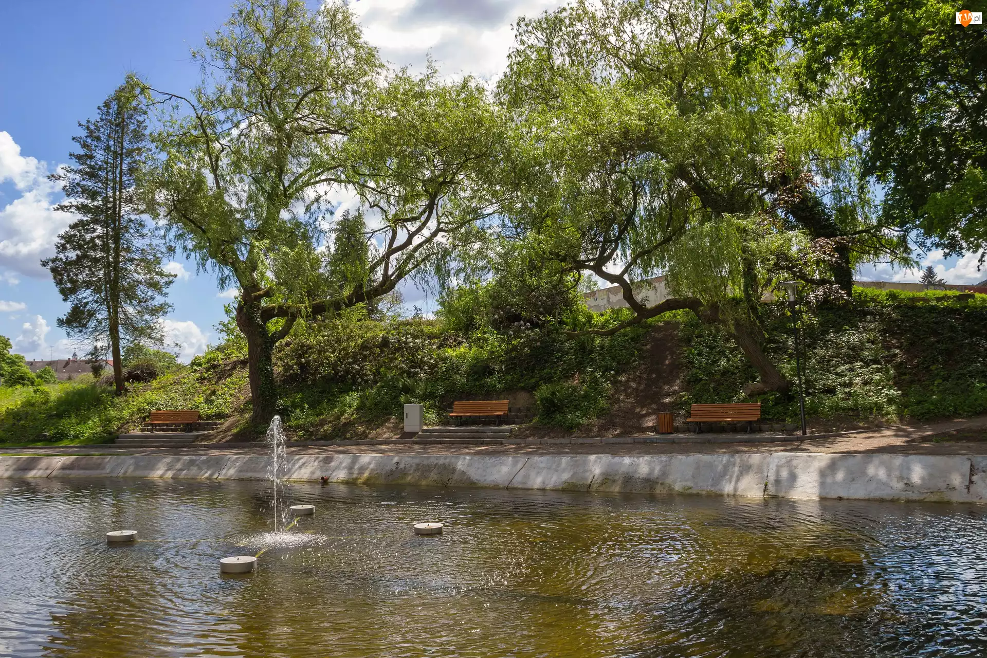 Ławki pod drzewami przy fontannie w parku