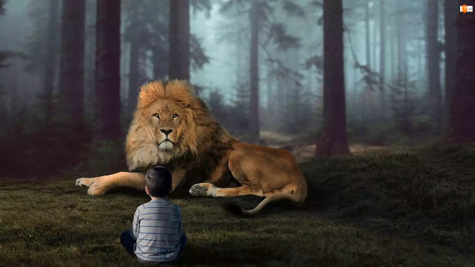 Lew, Mgła, Chłopiec, Dziecko, Las