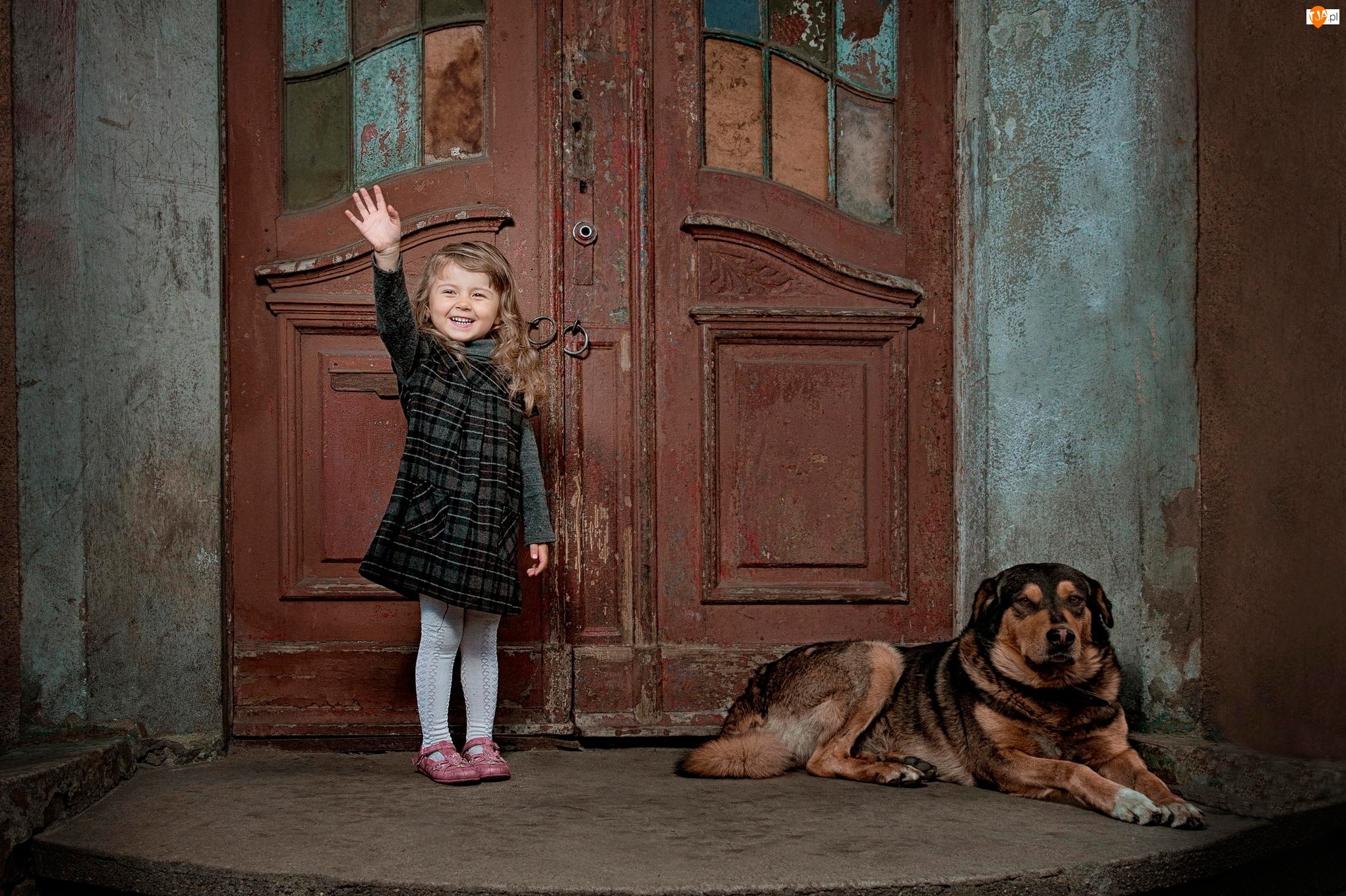 Leżący, Stare, Dziecko, Drzwi, Dziewczynka, Pies
