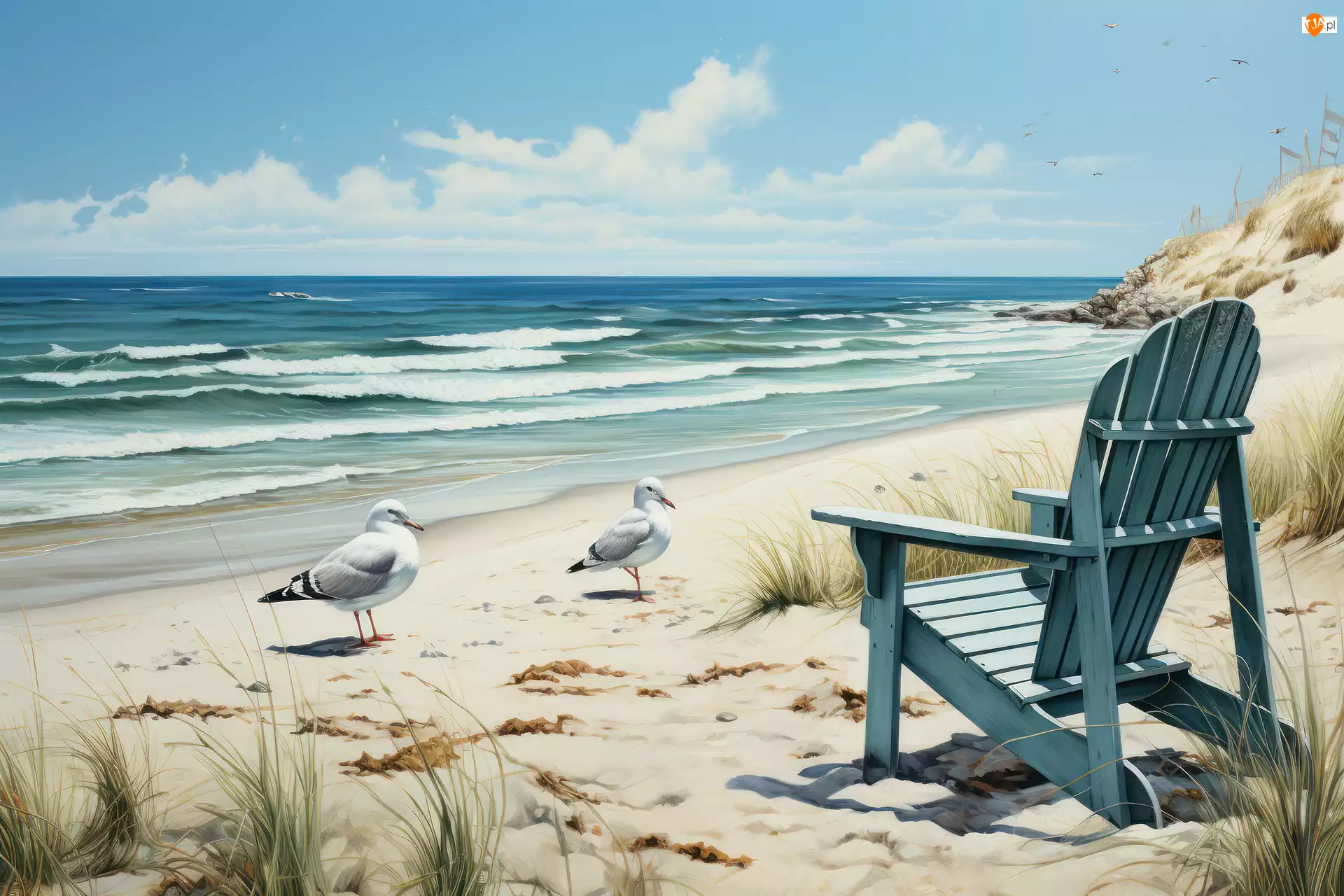 Leżak, Grafika, Plaża, Morze, Mewy Painto