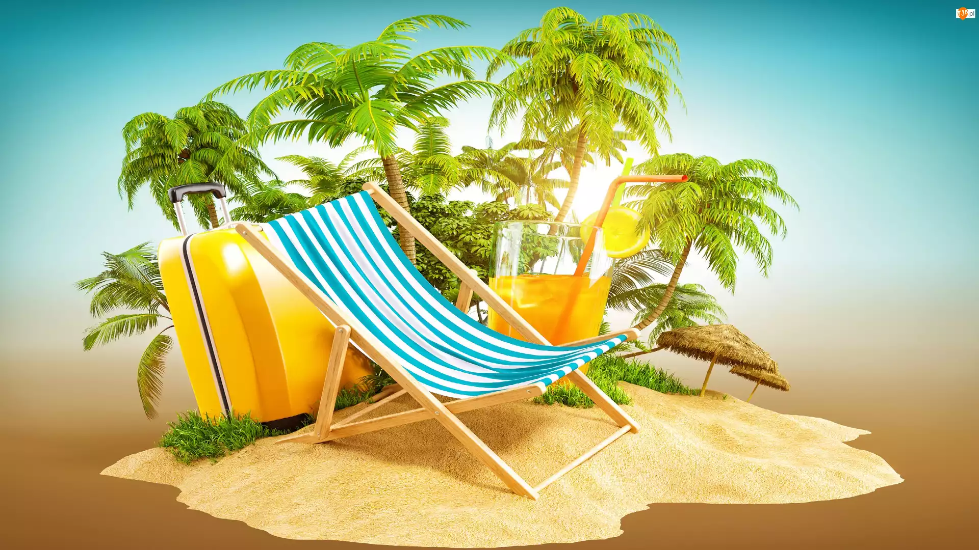 Walizki, Leżak, Palmy, Grafika 2D, Sok, Wakacje