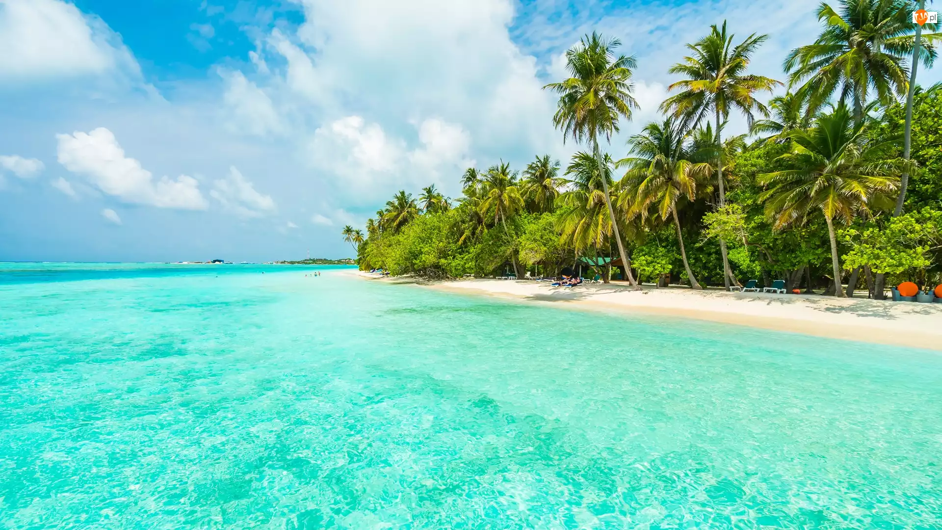 Leżaki, Chmury, Plaża, Morze, Palmy