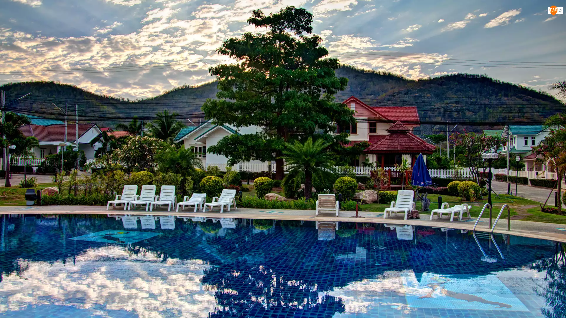 Domy, Basen, Drzewa, Wakacje, Leżaki, Góry