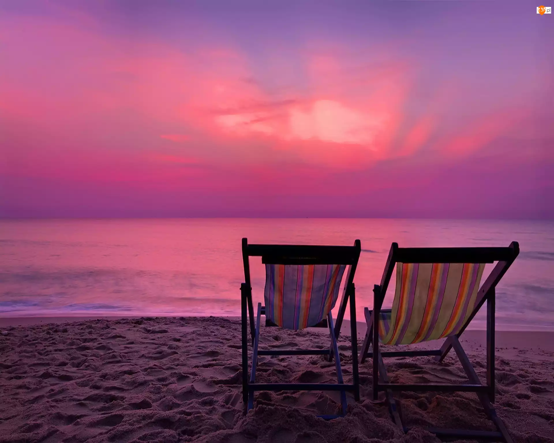 Leżaki, Morze, Zachód, Wakacje, Słońca, Plaża
