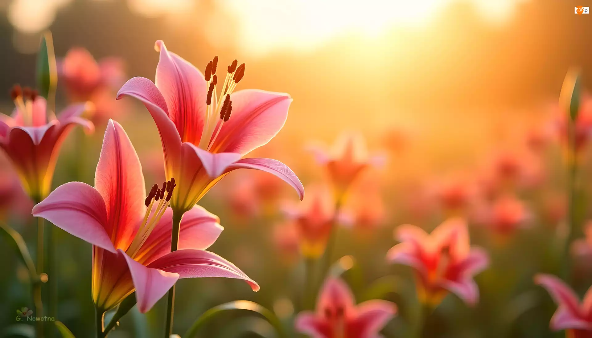 Lilie, Różowe, Rozświetlone, Grafika, Kwiaty, T