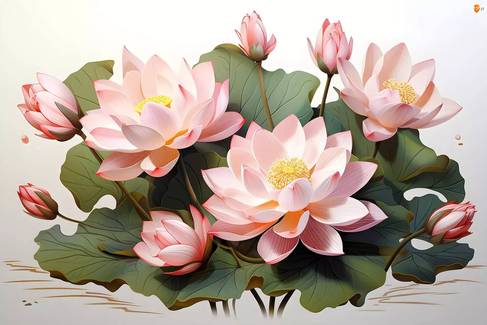 Lilie wodne, 2D, Kwiaty, Różowe, Listki