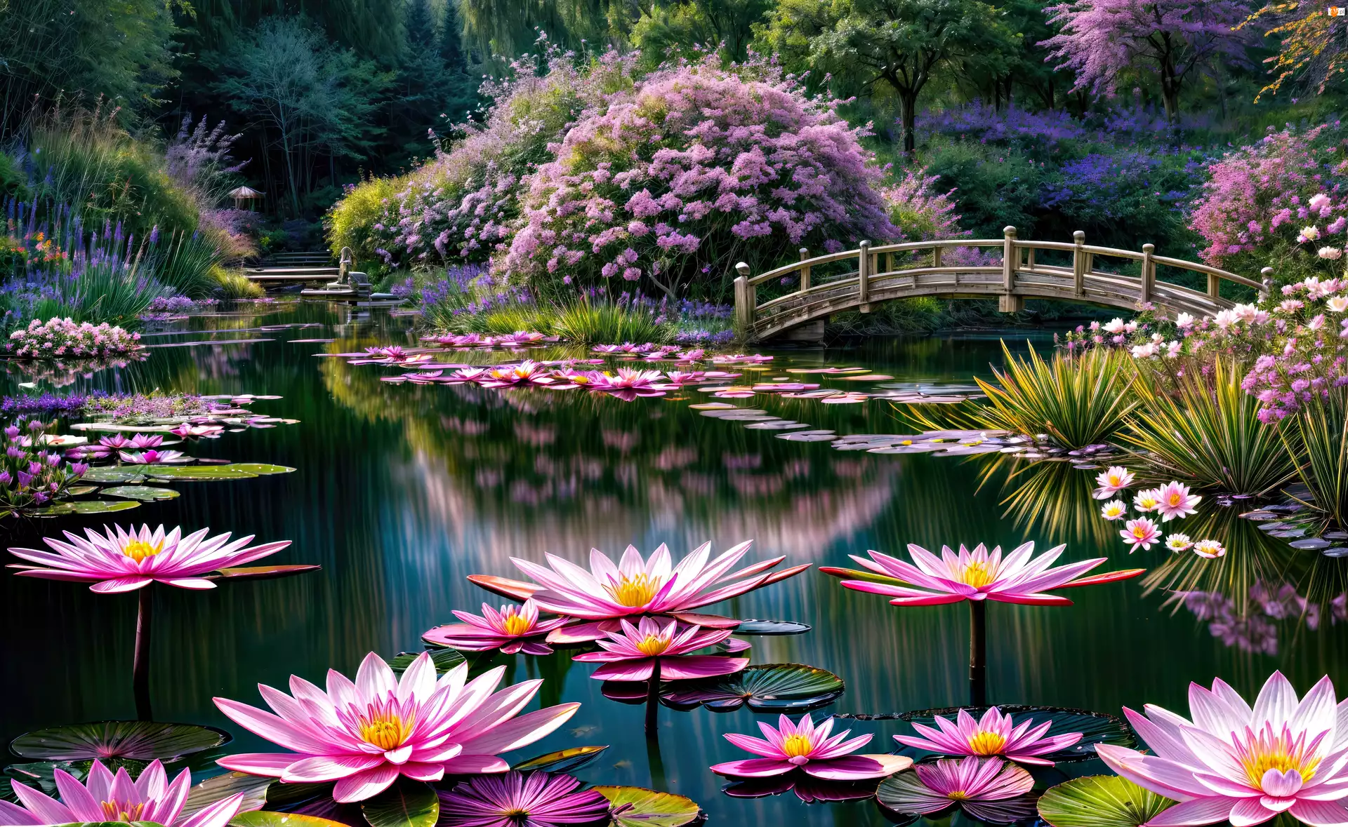 Lilie wodne, Grafika, Staw, Ogród, Mostek