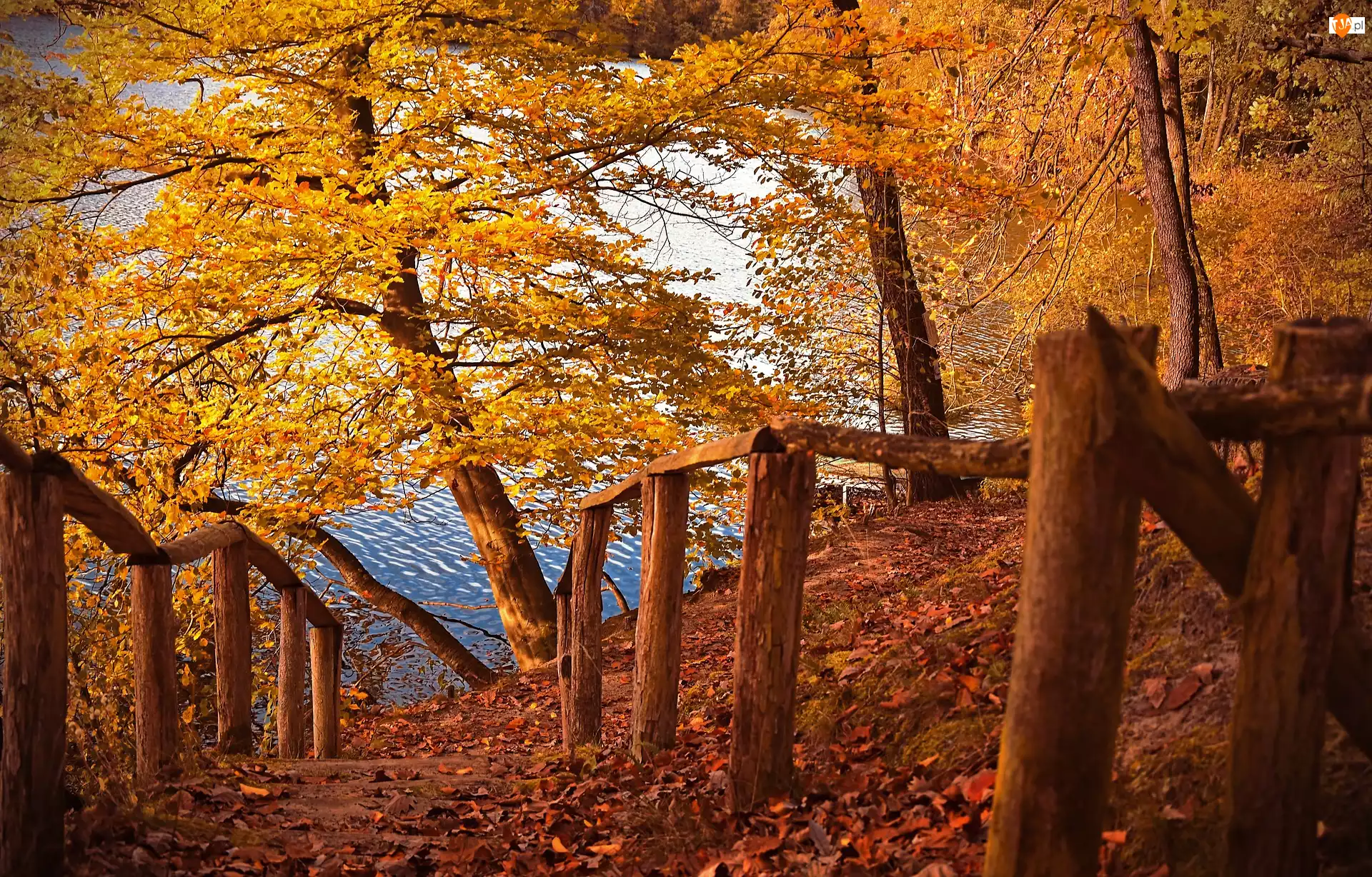 Liściaste, Jesień, Jezioro, Drzewa, Balustrada, Ogrodzenie, Liście