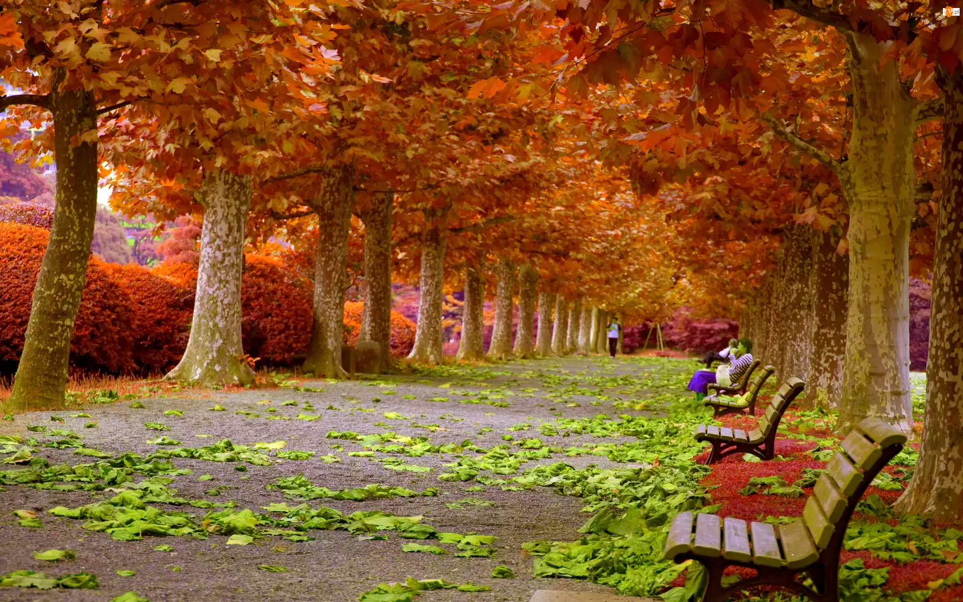 Liście, Alejka, Drzewa, Ławki, Kolorowe, Park