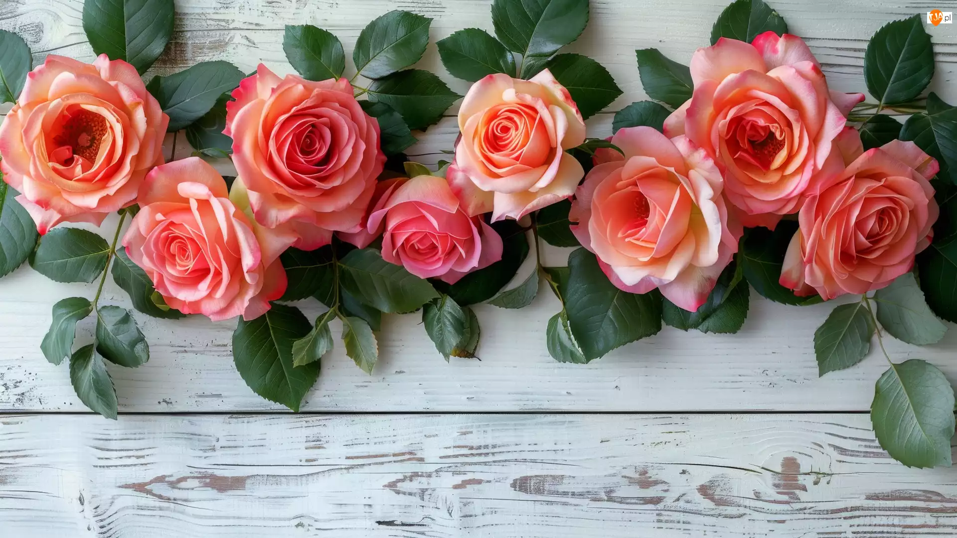 Liście, Deski, Róże, Kwiaty, Drewniane