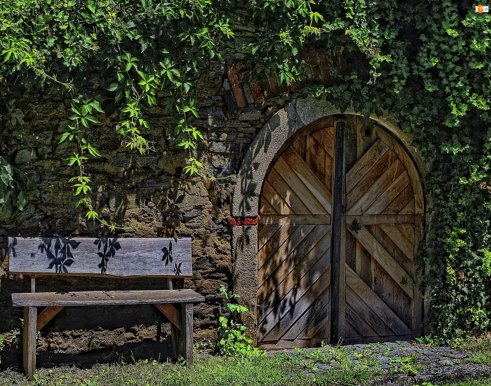 Liście, Drzwi, Ogródek, Ławka, Mur, Brama