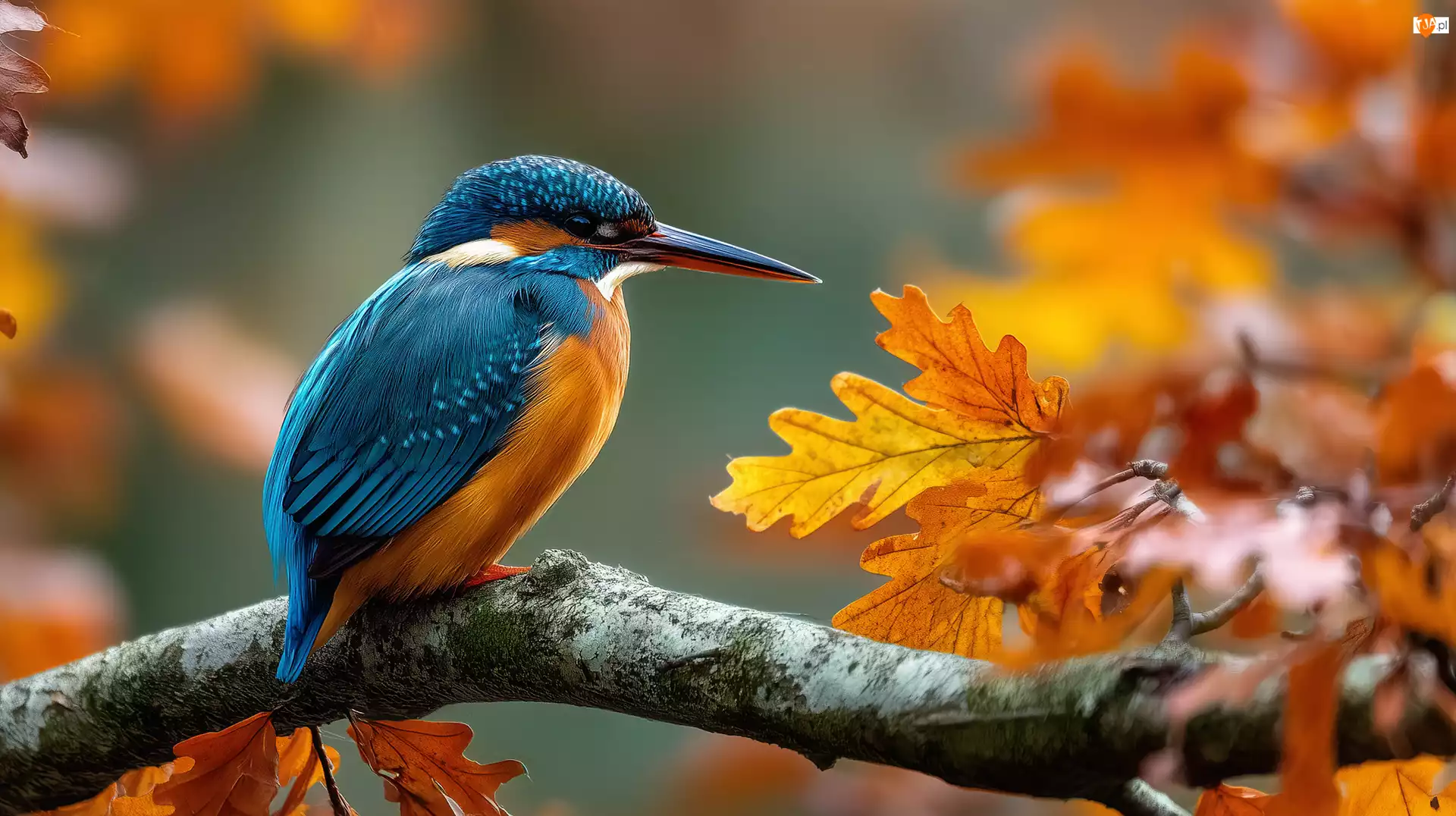 Liście, Grafika AI, Gałąź, Zimorodek, Dębu