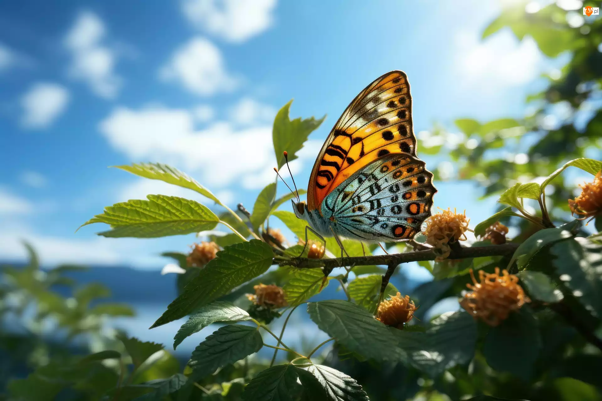 Liście, Grafika, Gałąź, Motyl, Niebo