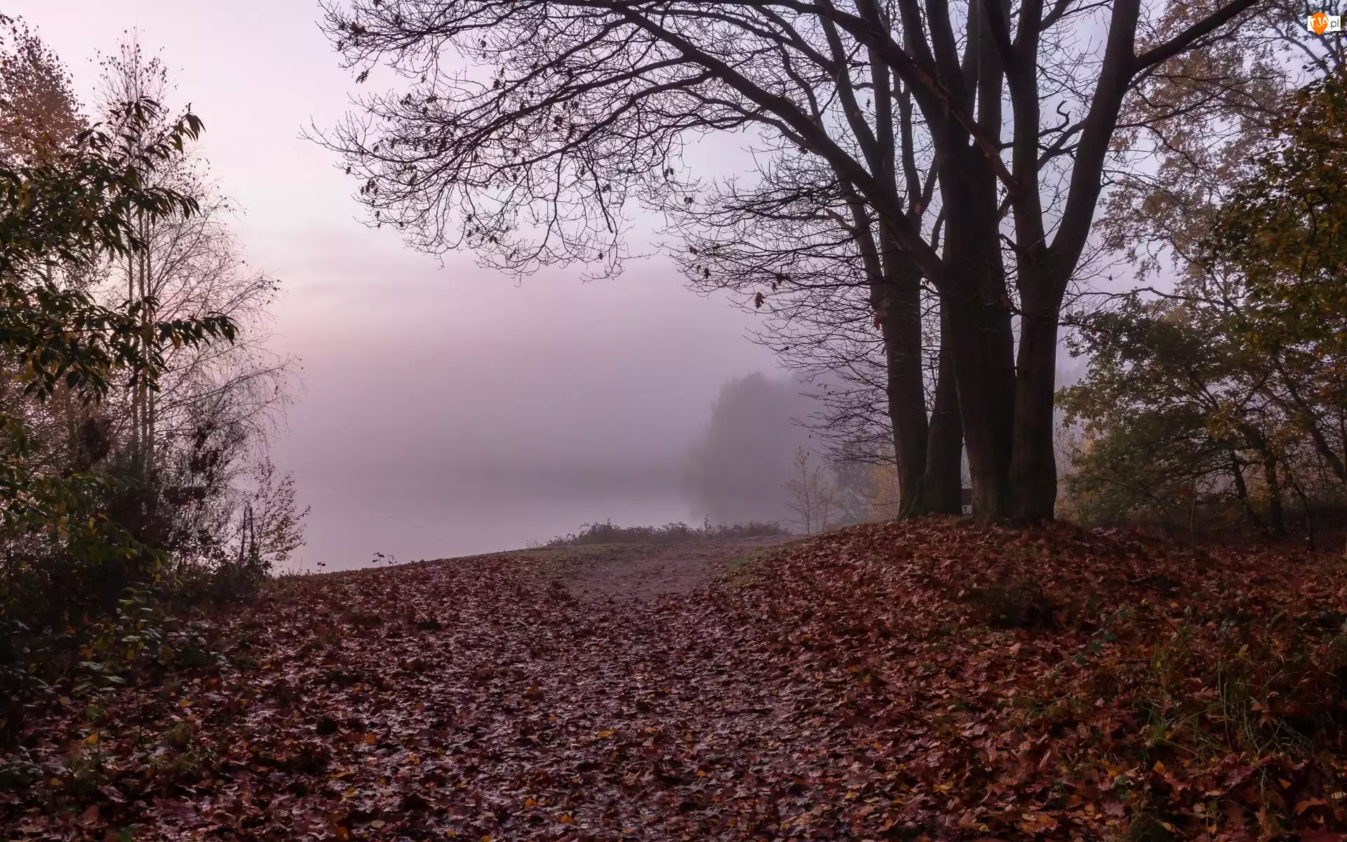 Liście, Jesień, Las, Mgła, Zeschnięte