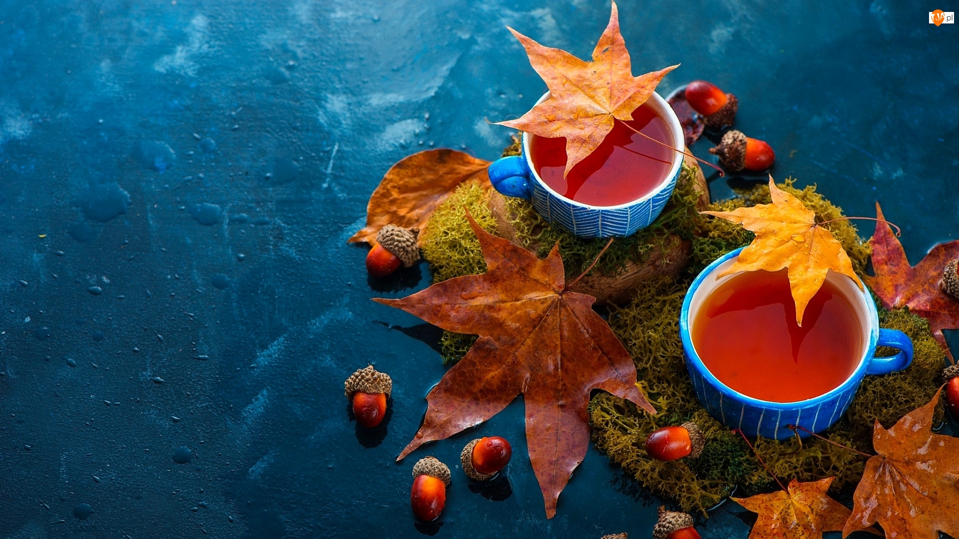Niebieskie, Herbata, Liście, Mech, Filiżanki, Żołędzie