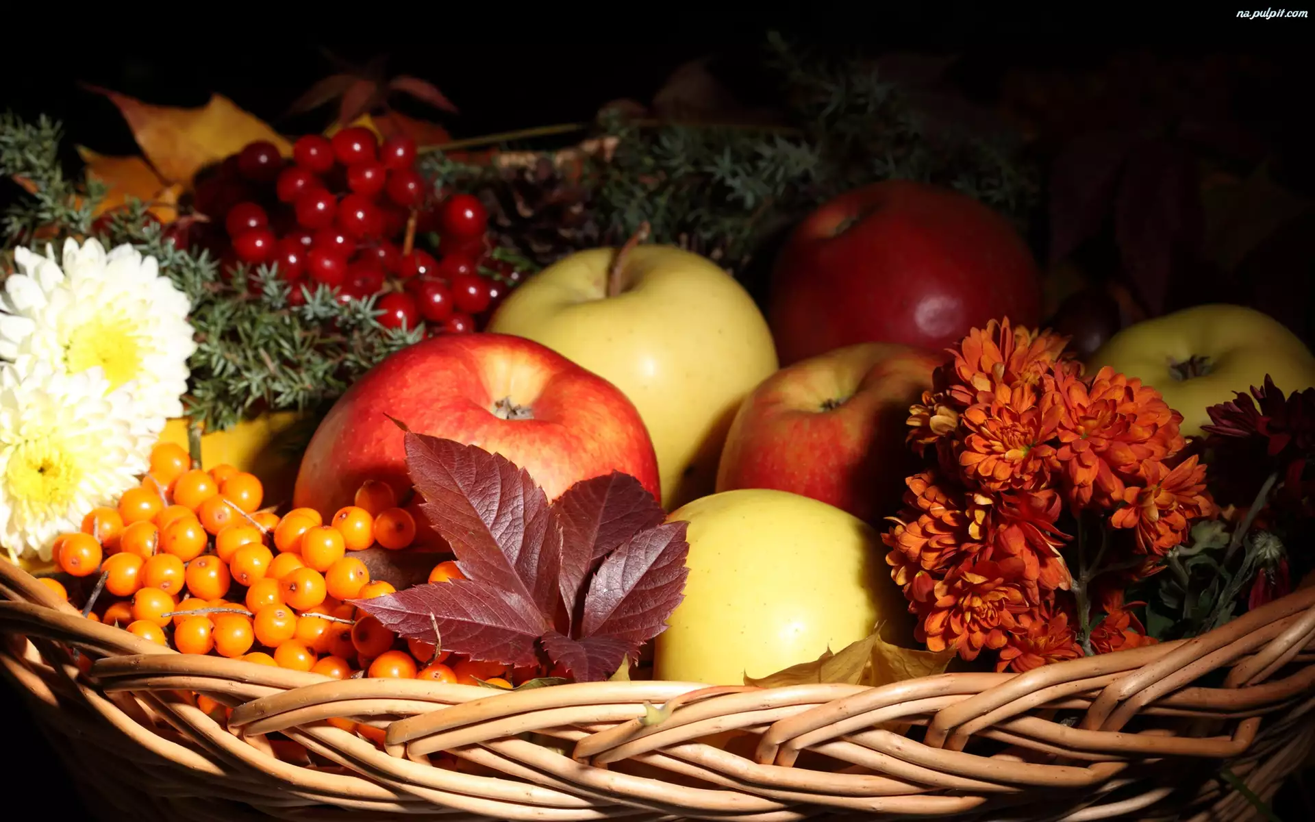 Liście, Kompozycja, Kwiaty, Jabłka, Kosz