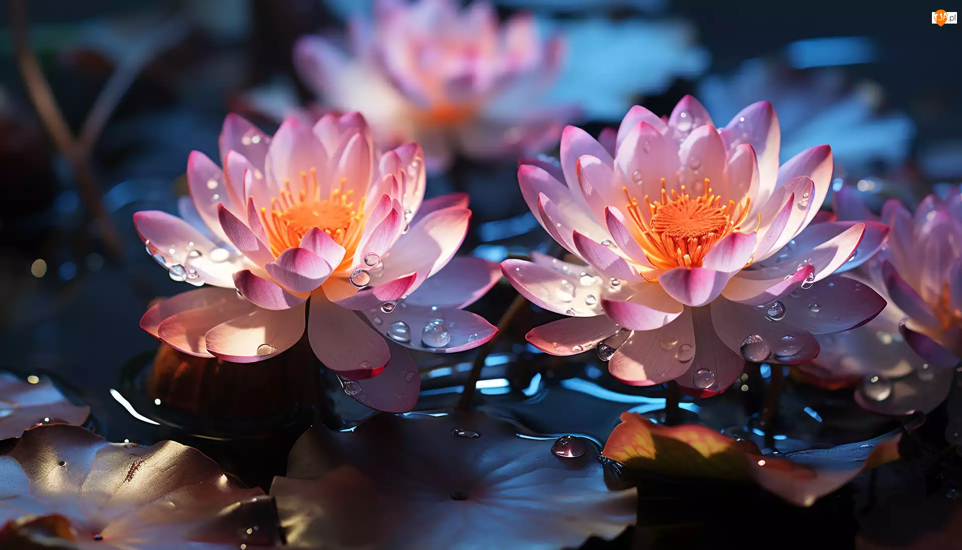 Liście, Kwiaty, Lilie wodne, Krople