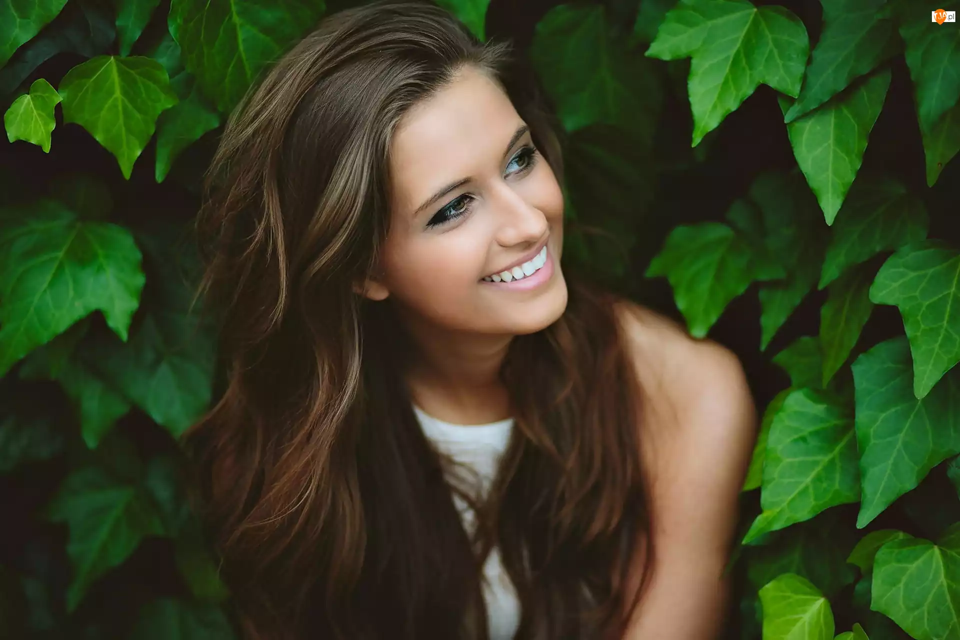 Liście, Uśmiechnięta, Makijaż, Dziewczyna, Drz