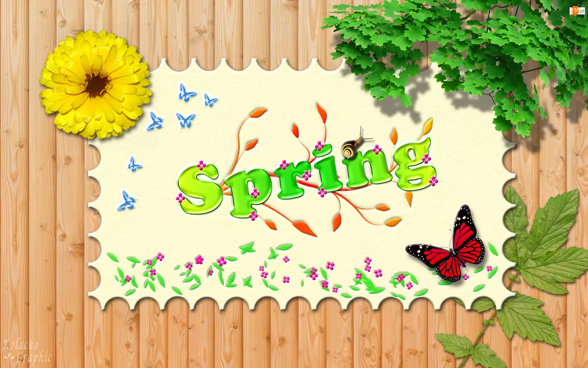 Liście, Wiosna, Motylki, Napis, Kwiat