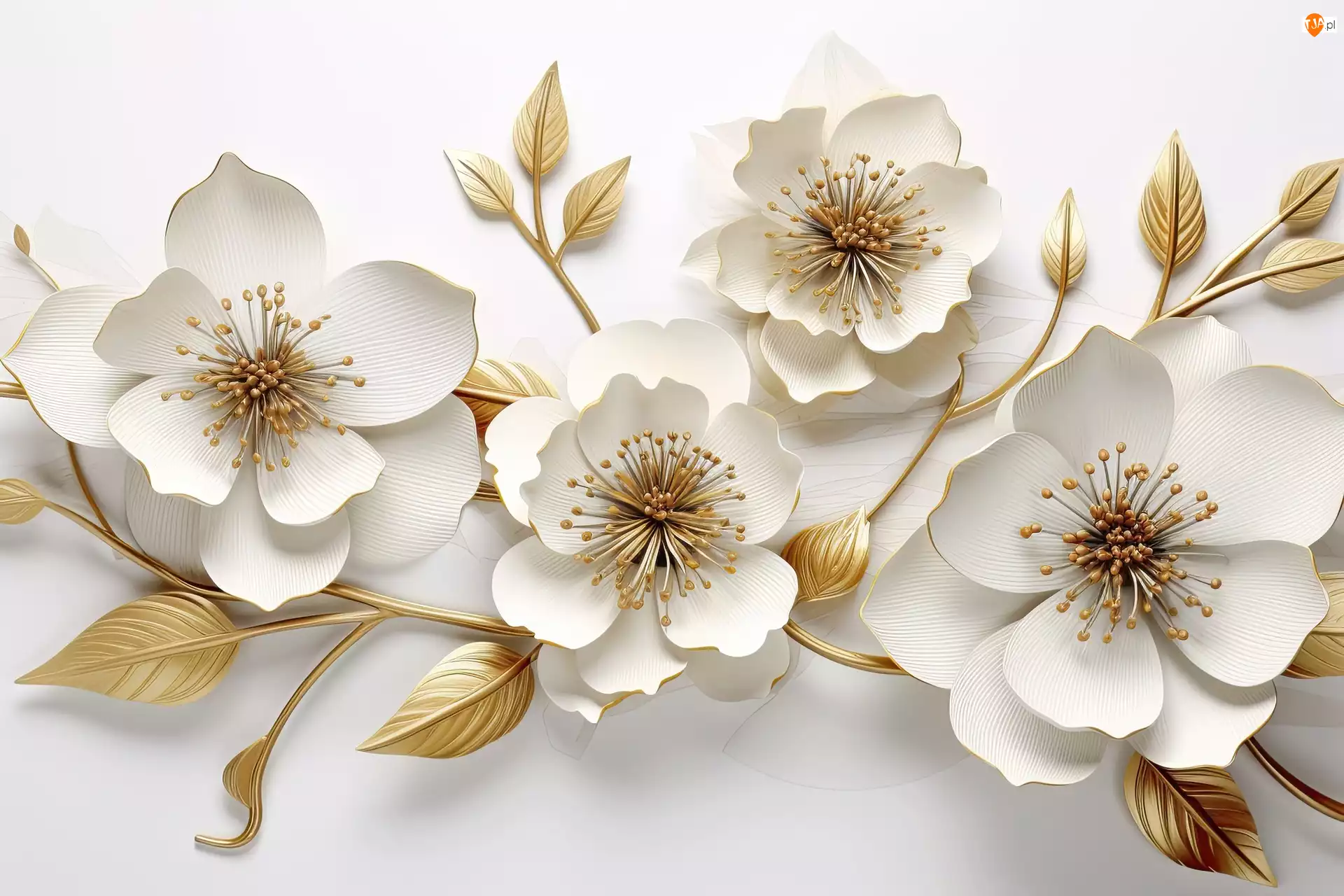 Listki, Grafika, Kwiaty, Biało-złote, Gałązki