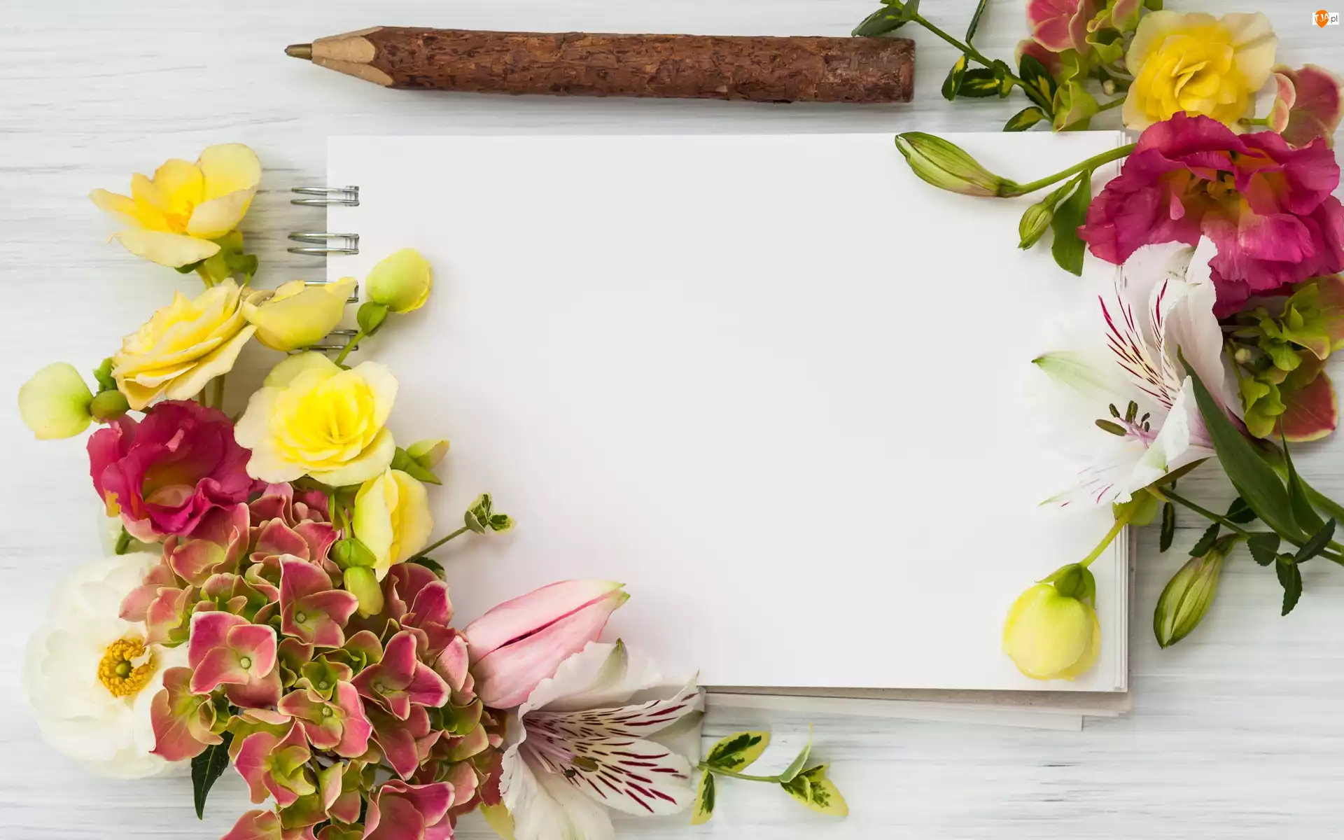 Listki, Kompozycja, Róże, Tulipan, Lilia, Notes, Ołówek, Kwiaty, Hortensja