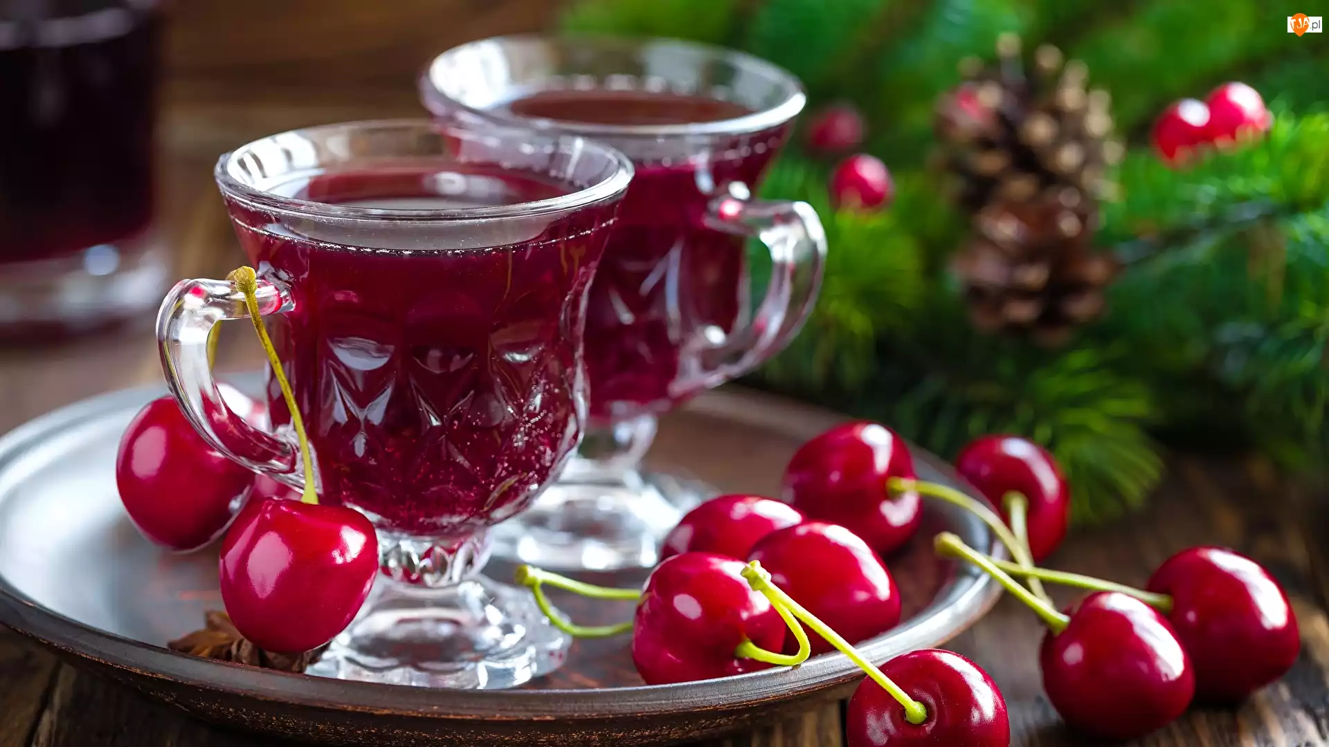Nalewka, Napój alkoholowy, Wiśnie, Rozmyte tło, Kieliszki, Taca