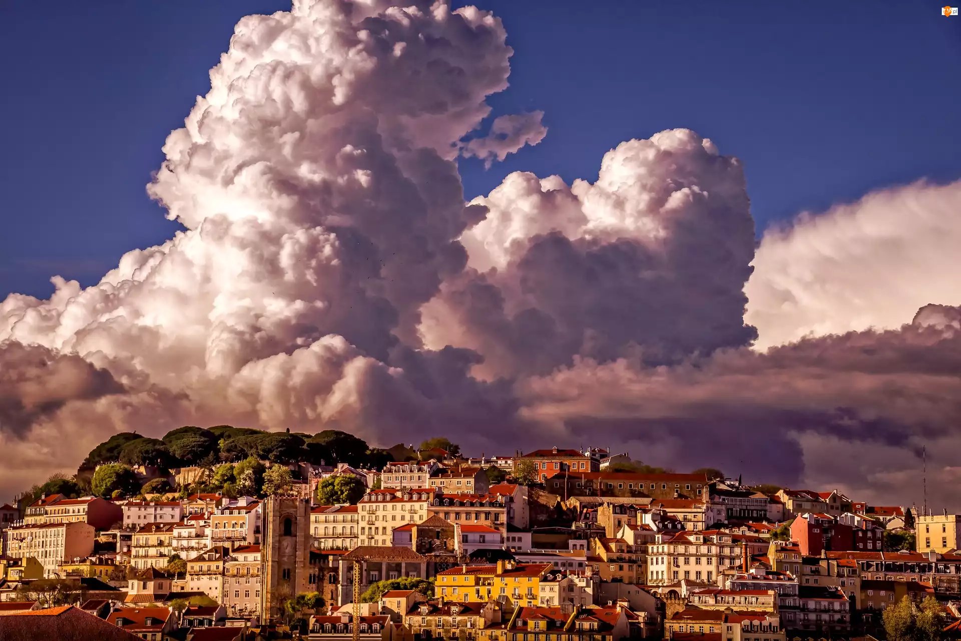 Lizbony, Niebo, Panorama, Budynki, Zachmurzone