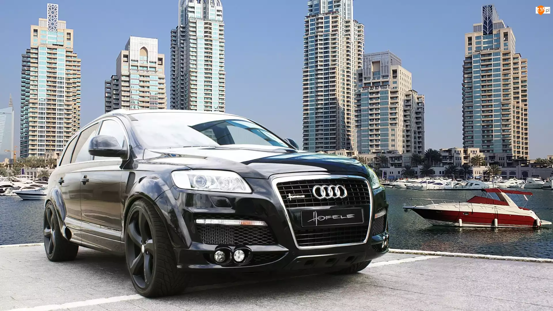 Łódka, Audi Q7, Miasto, Wieżowce, Rzeka