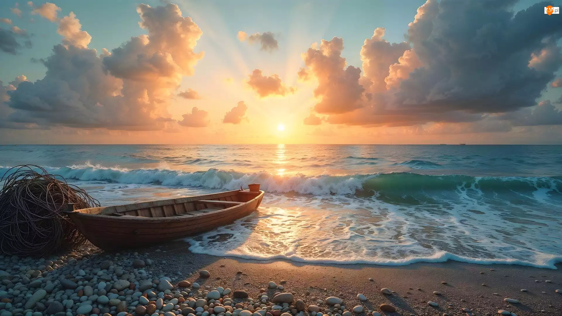 Tagi: Plaża  Zachód słońca  Łódka  Morze  Fale