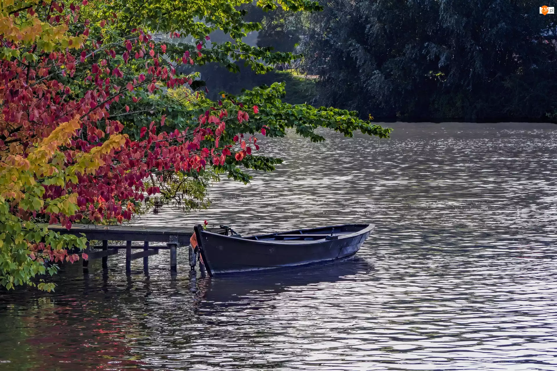 Łódka, Drzewa, Pomost, Rzeka, Kolorowe