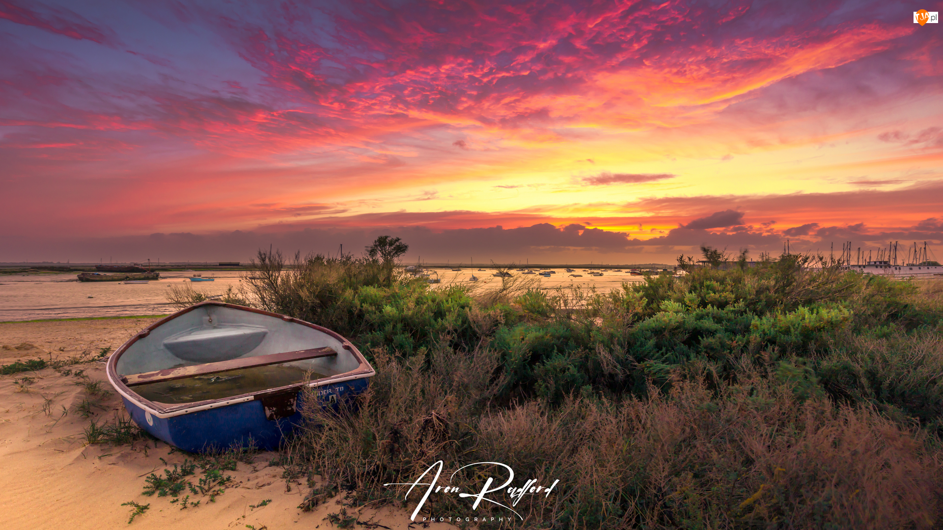 Łódka, Plaża, Zachód słońca, Morze, Chmury, Krzewy, Trawa