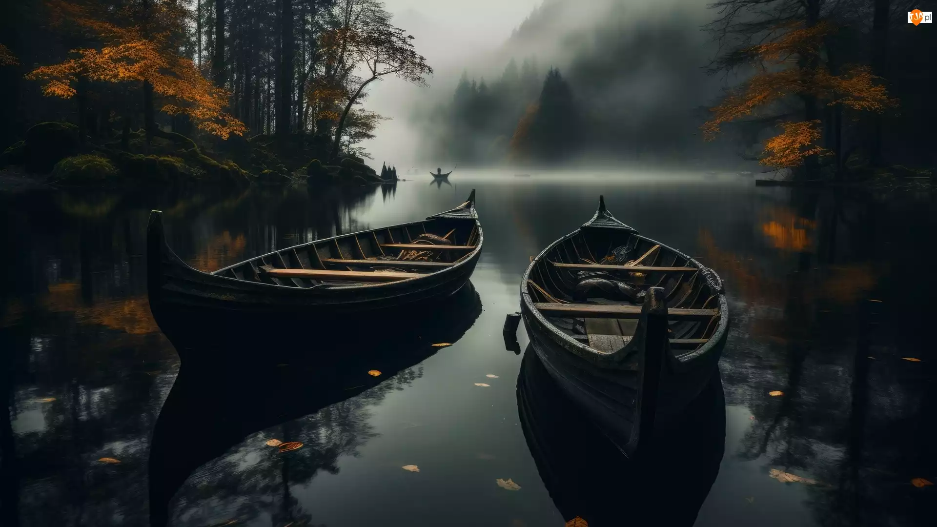 Łódki, Jezioro, Drzewa, Dwie, Jesień, Mgła, Góry