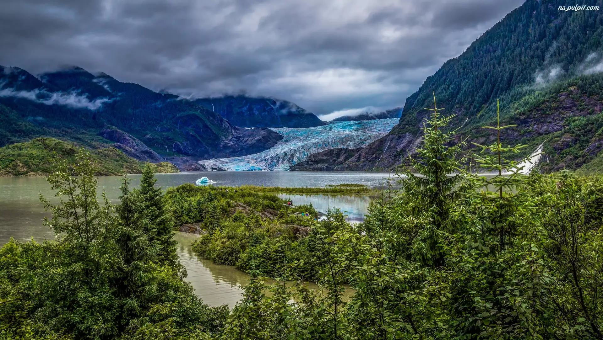 Jezioro Eklutna Lake, Lodowiec, Stany Zjednoczone, Góry, Stan Alaska, Chmury, Drzewa