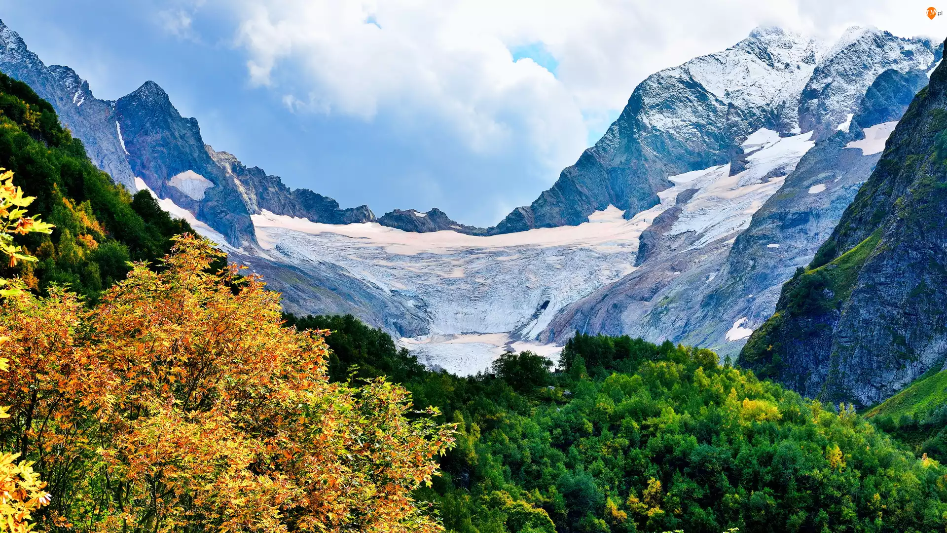 Las, Góry Dombaj, Lodowiec Ptysz, Karaczajo-Czerkiesja, Wąwóz, Drzewa, Rosja, Teberdyński Park Narodowy