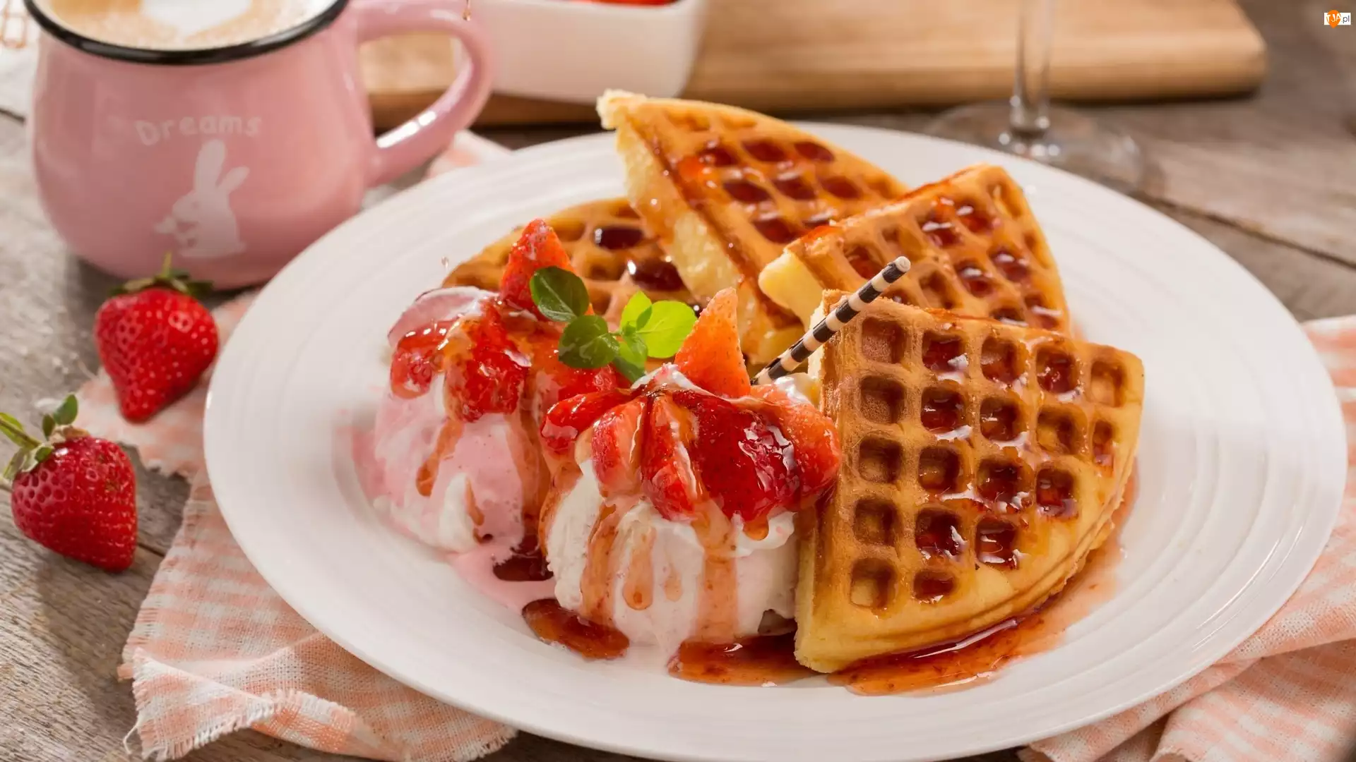 Lody, Gofry, Talerz, Ścierka, Syrop, Truskawki