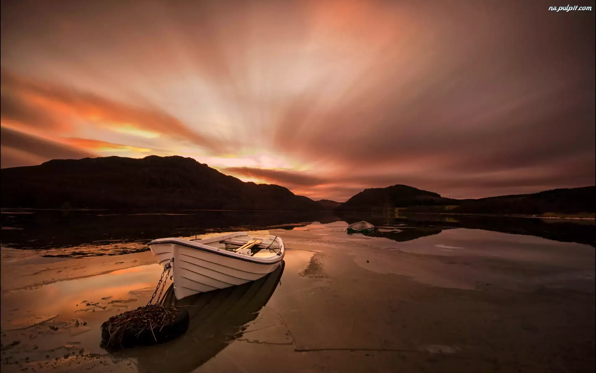 Łódź, Zachód, Góry, Słońca, Jezioro