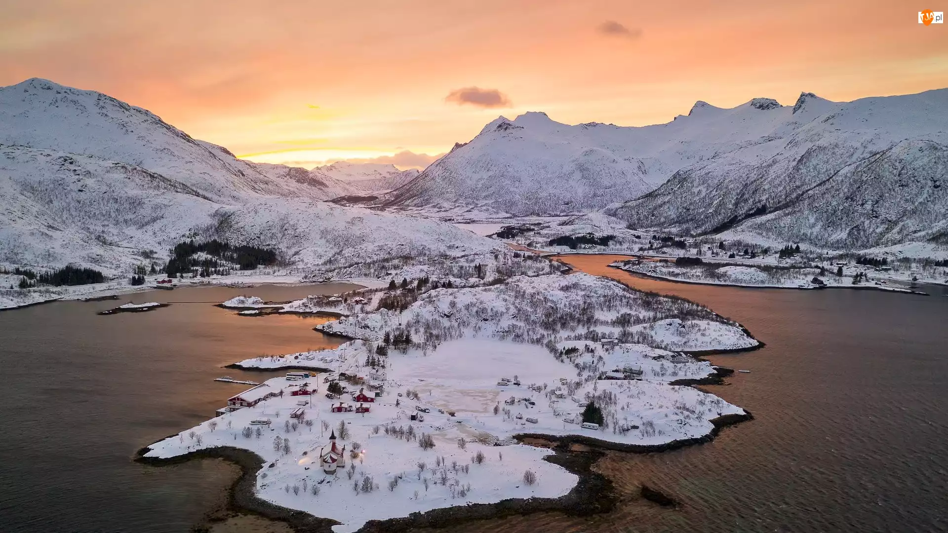 Lofoty, Gmina Vagan, Wschód słońca, Norwegia, Zima, Góry, Domy
