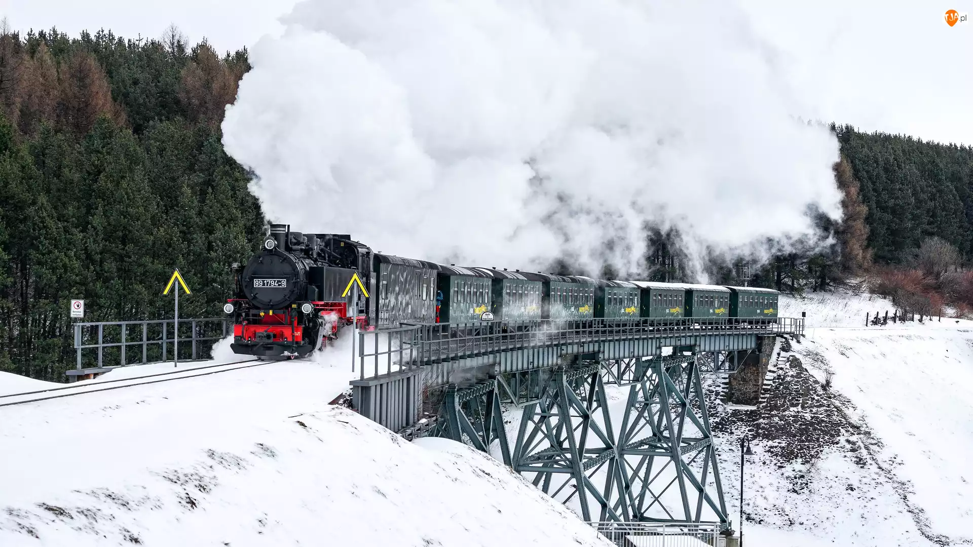 Lokomotywa, Pociąg, Zima, Most, Parowa, Śnieg