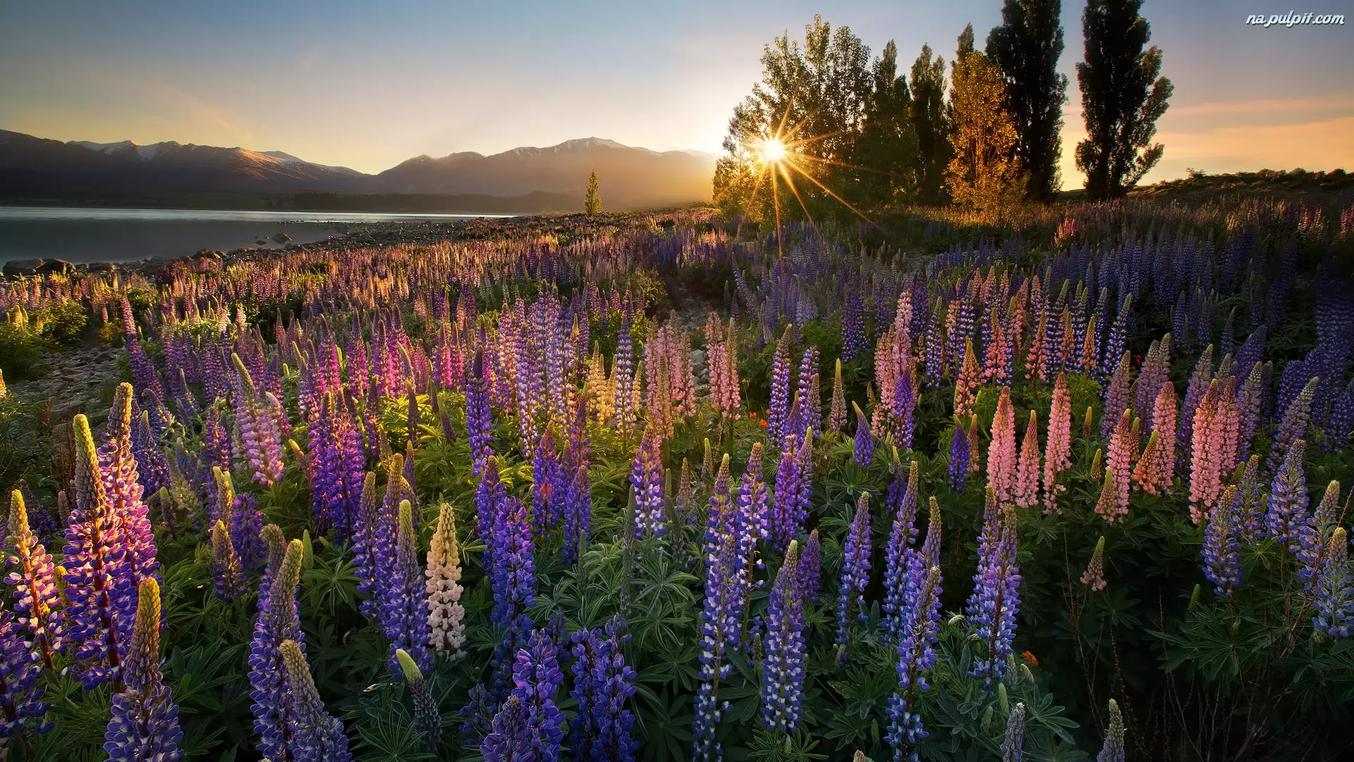 Promienie słońca, Łąka, Łubiny, Jezioro Tekapo, Kolorowe, Drzewa, Nowa Zelandia, Kwiaty