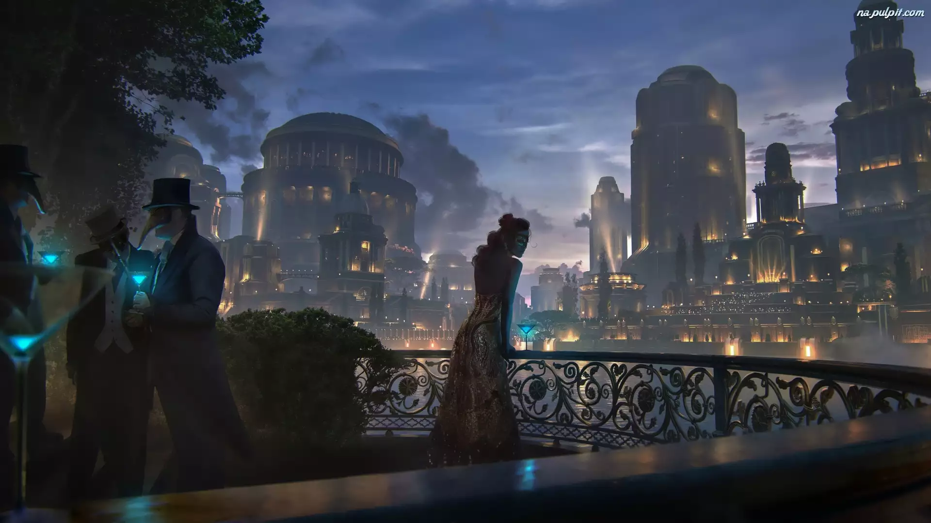 Miasto, Taras, Wieczór, Digital Art, Maska, Kobieta, Ludzie