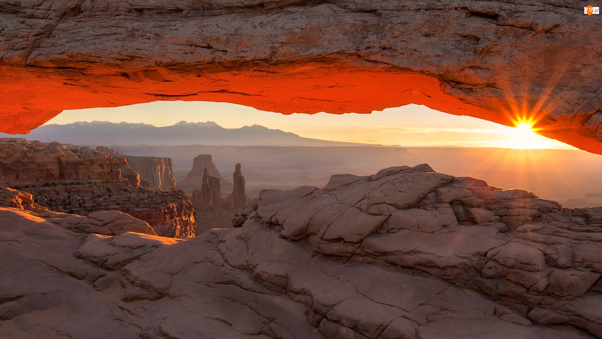 Stan Utah, Park Narodowy Canyonlands, Wschód słońca, Stany Zjednoczone, Promienie słońca, Skały, Łuk Mesa Arch